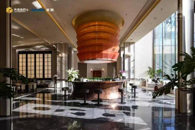 透过约10米高玻璃落地窗,下沉庭院花园6米山石瀑布、层层叠叠的流水与珍贵树木构成的美景尽收眼底。在这里,业主可以与家人朋友享受惬意的下午茶时光,感受 “海派” 生活的悠闲与精致!