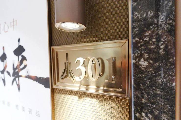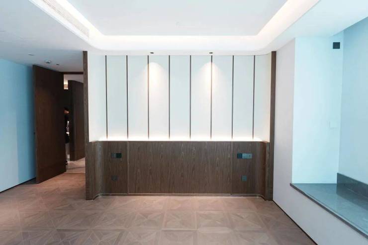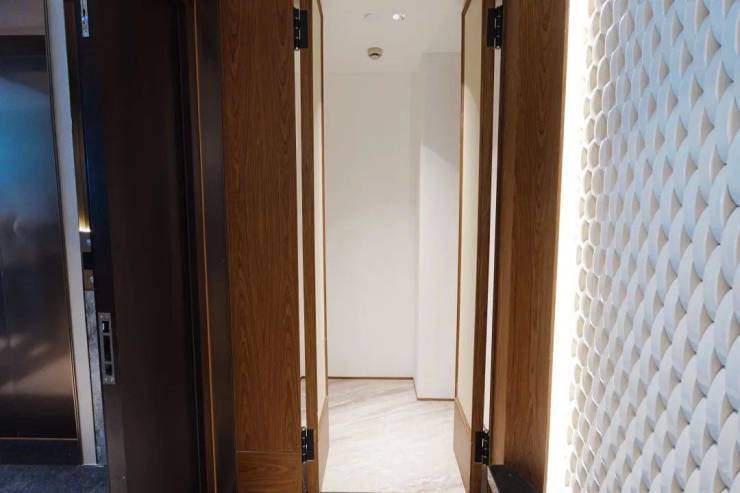 安高这次打造的交付样板间,是从电梯厅开始的。107㎡是一梯两户,电梯间区域,主要以不锈钢条作为通高区域的墙面划分,吊顶带金属弧线。入户门前,金属面板搭配编织纹,从上方打下来的暖色调灯光,映照在项目logo和室号之上,让业主从电梯里出来走到家门的时候就已经给满了仪式感。