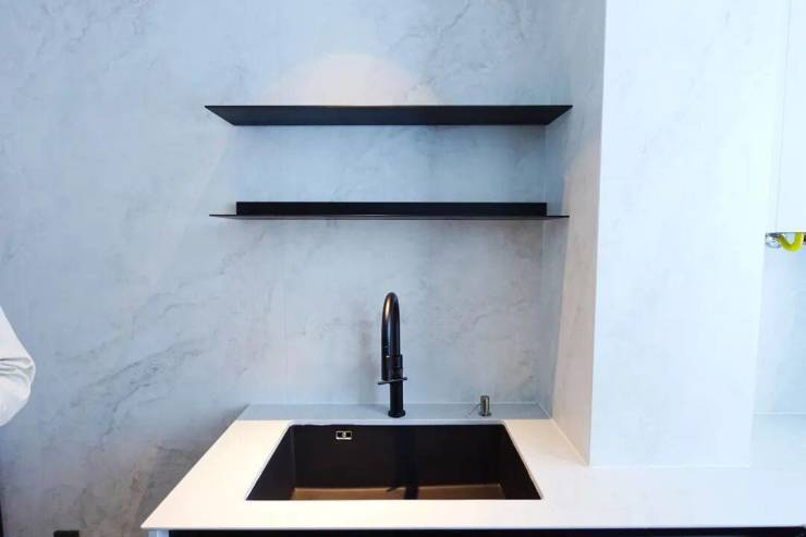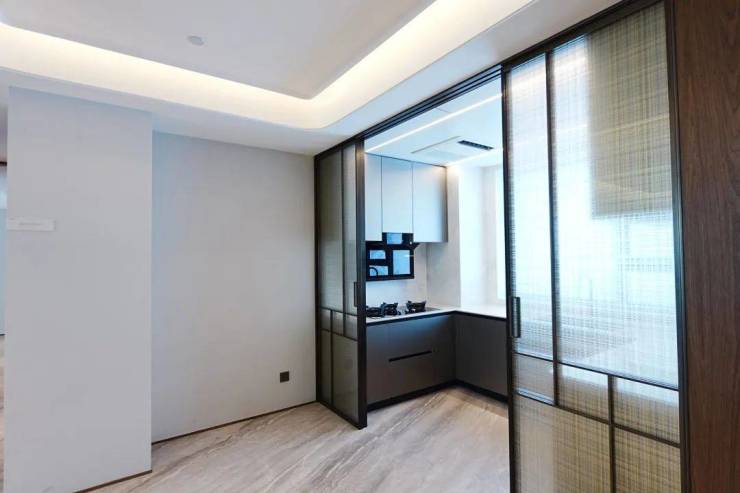 博世4件套(油烟机+燃气灶+洗碗机+烤箱),采用了大功率的侧吸油烟机和一个三眼灶,预留了双开门冰箱位置,还有怡口过滤器。上轨道三移门、可移动轨道插座、置物架也有。