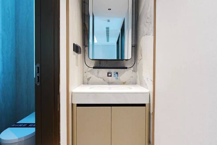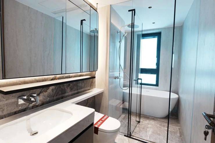两个卫生间,主卧套房带独卫,客卫干湿分离。汉斯格雅花洒+龙头、杜拉维特台盆+洁具,两个镜柜均内置插座和消毒牙刷架,主卫镜柜更增配了美妆冰箱。