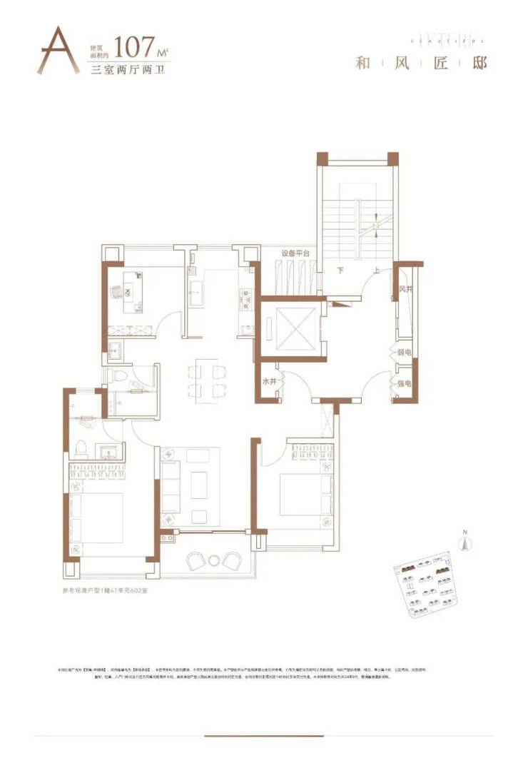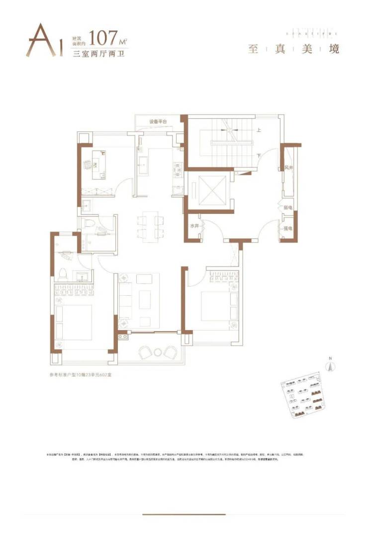 建面约107㎡3房2厅2卫户型