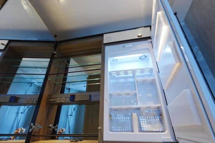 厨房的橱柜板材和107㎡颜色不同,冰箱位置就预留在餐厅一侧。其余配置没什么差别。