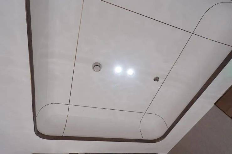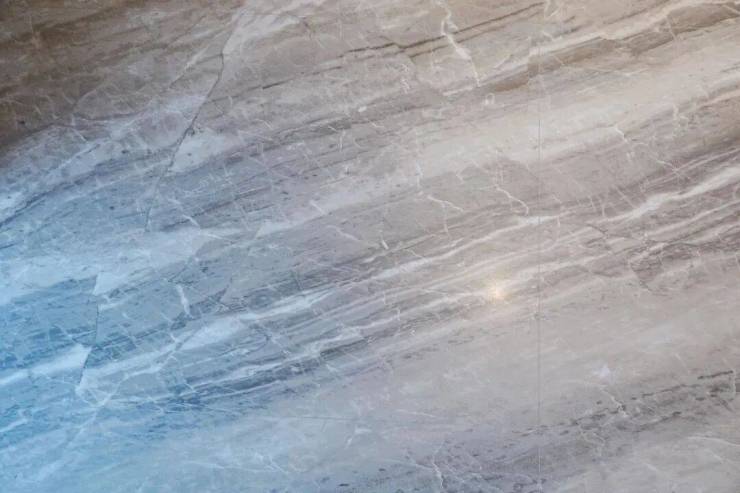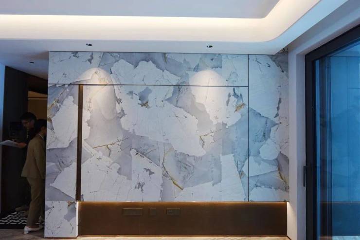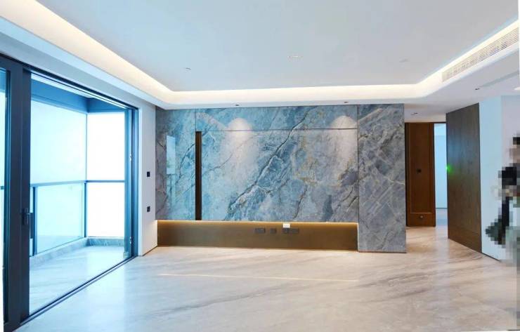 客厅则是弧形转角的悬浮吊顶,无主灯设计,电视机背景墙也是大块的岩板。