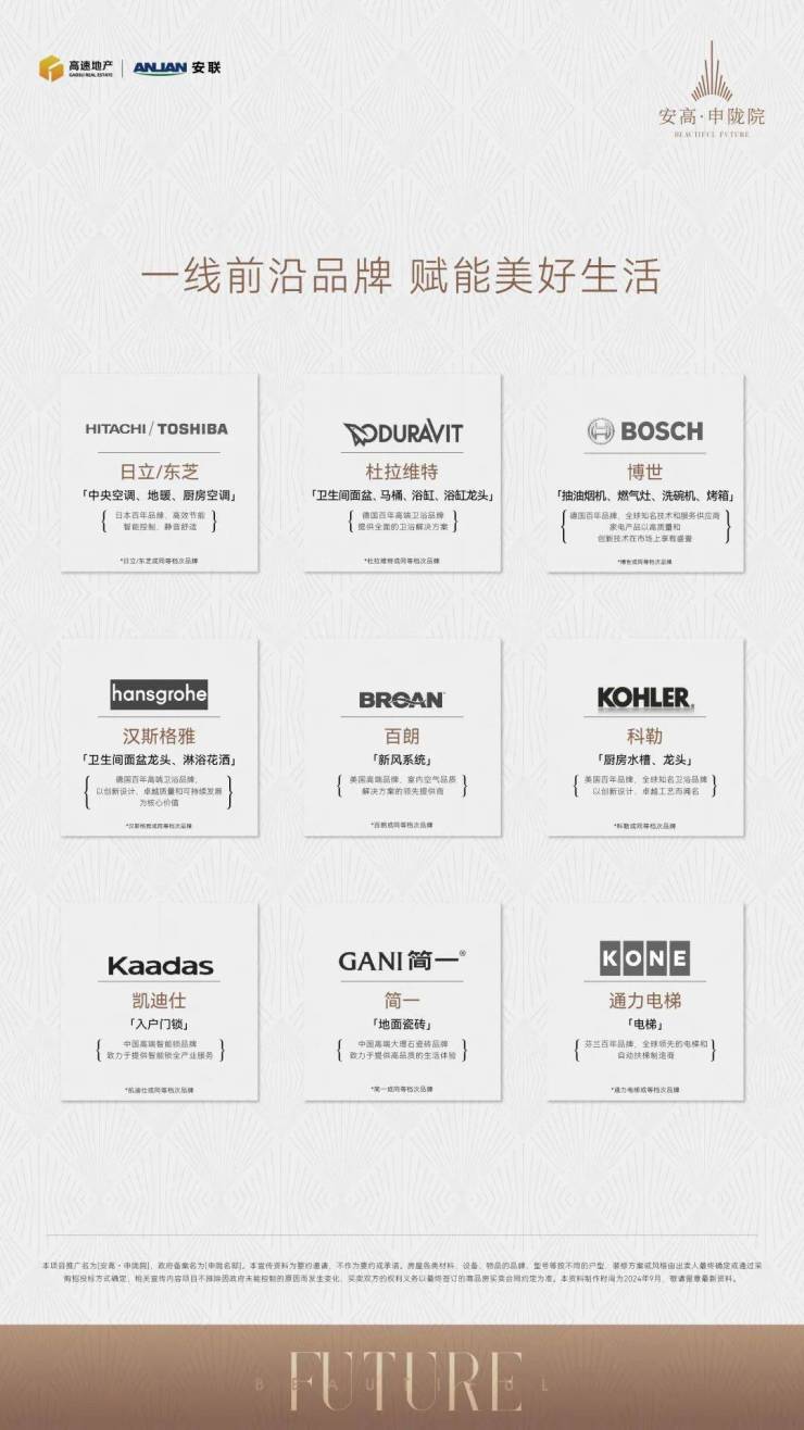 精选国际一线品牌:全屋配置简一瓷砖、百朗新风系统(或同等品牌);日立或东芝(或同等品牌)中央空调、地暖以及厨房空调;