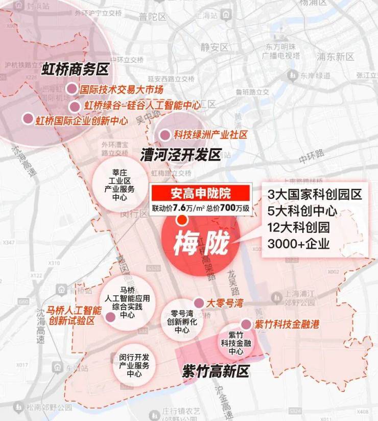 梅陇周边有3大国家级产业区、5大科创中心、12大科创园、3000+企业,直线距离约7公里范围内拥有漕河泾开发区、紫竹高新技术产业园等科创基地。据悉,漕河泾开发区有望入住梅陇,为增强闵行中部地区科技创新活力。