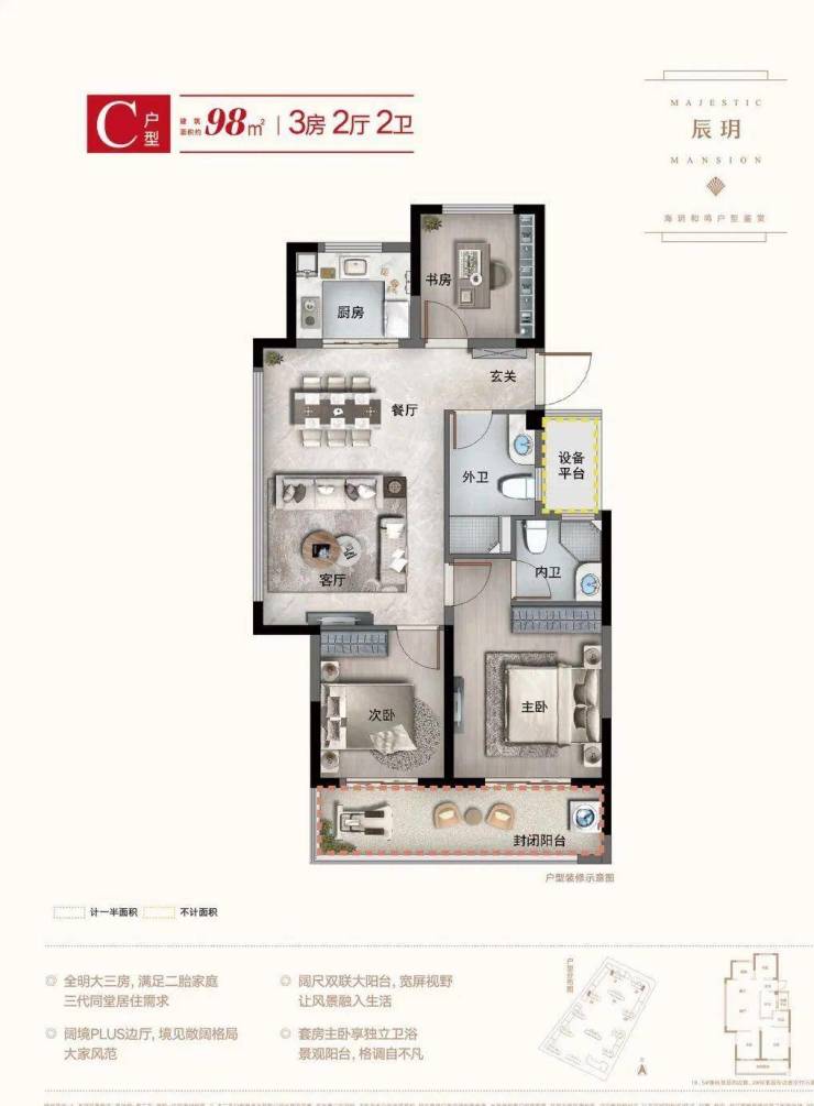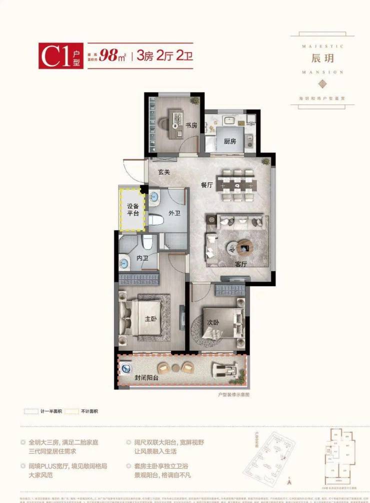 宽景阳台:客餐厅豁达相连,外接双开间宽屏大阳台,畅享四季景致