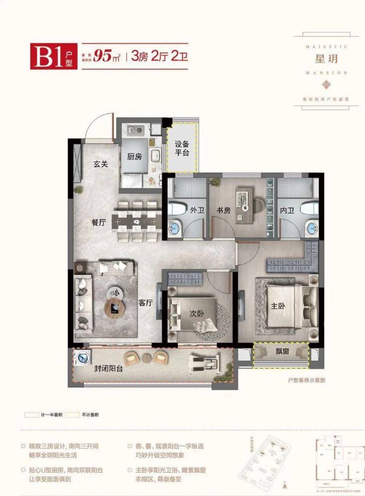 高层 B1户型 建筑面积约95㎡ 3房2厅2卫