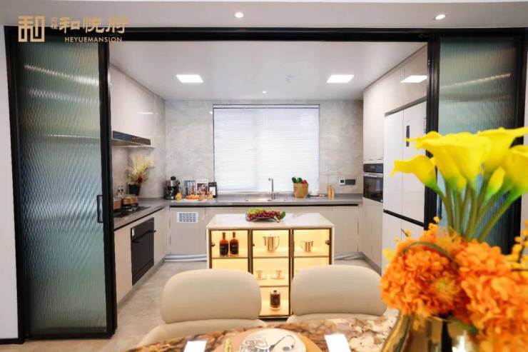 三个朝南开间带来充足的阳光,U型厨房布局,烹饪时刻优雅自在,且与户门距离适中,避免了油烟困扰。