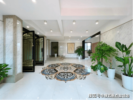 每栋楼也都是 地上地下双入户大堂 的设计,一层入户大堂地面采用了 曼陀罗拼花 造型,而且都是纯手工切割技术打造的定制款,造价颇高