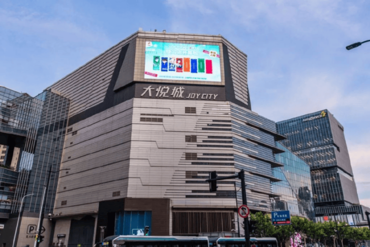 外立面采用新海派风格,以石材、真石漆、铝板三段式拼接,搭配红色线条,兼具质感与时尚。