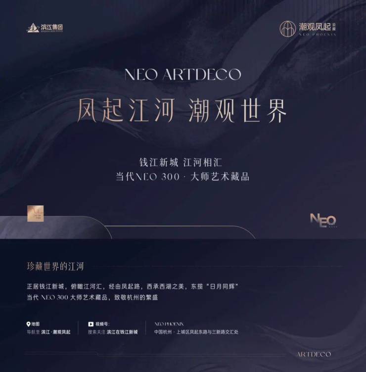 为了致敬杭州的繁盛,滨江集团力邀大师团队,融合ART DECO经典艺术,匠造「潮观凤起」,以当代NEO艺术300方,定标杭州鼎盛之作。