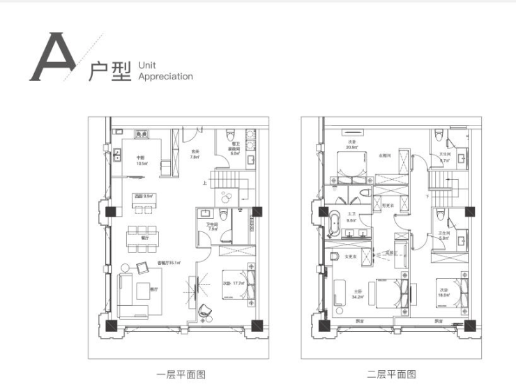 A户型:180度全景采光,超大尺度一体客餐厅,奢阔主卧。