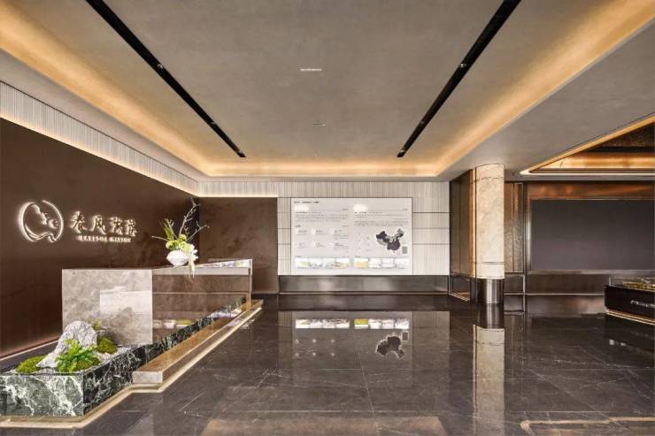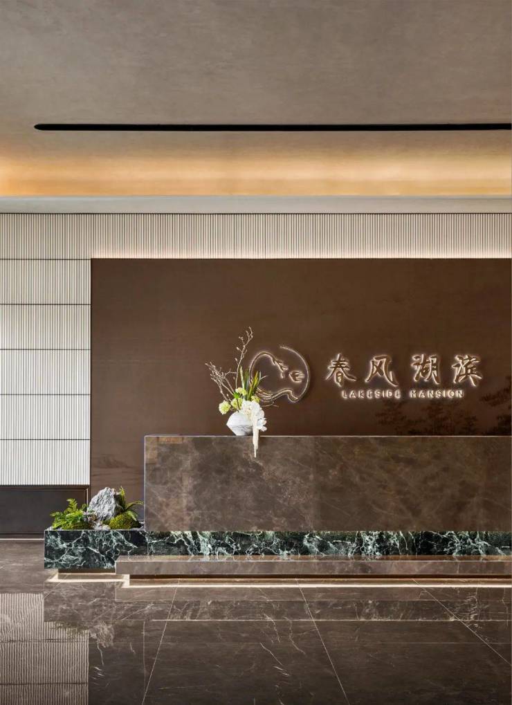 前台的设计,背景墙以山水画为引,通过精炼而抽象的手法,描摹出水面粼粼波光,画中梅影横斜,暗香浮动,充盈着江南水乡的秀丽柔情。