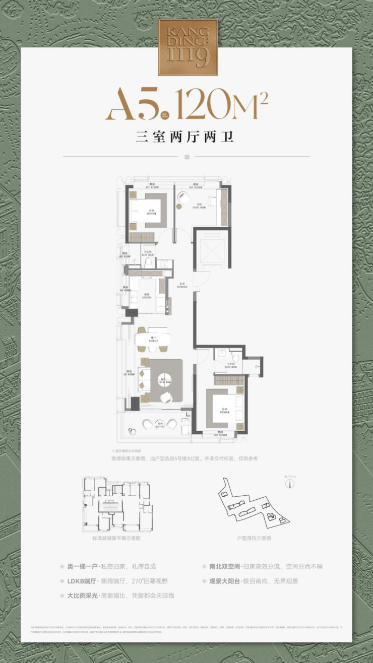建面约120㎡边套3房:位于整个社区的最西侧,约270°的巨幕视野让这个户型的采光、视野达到顶峰,低总价的上车首选;
