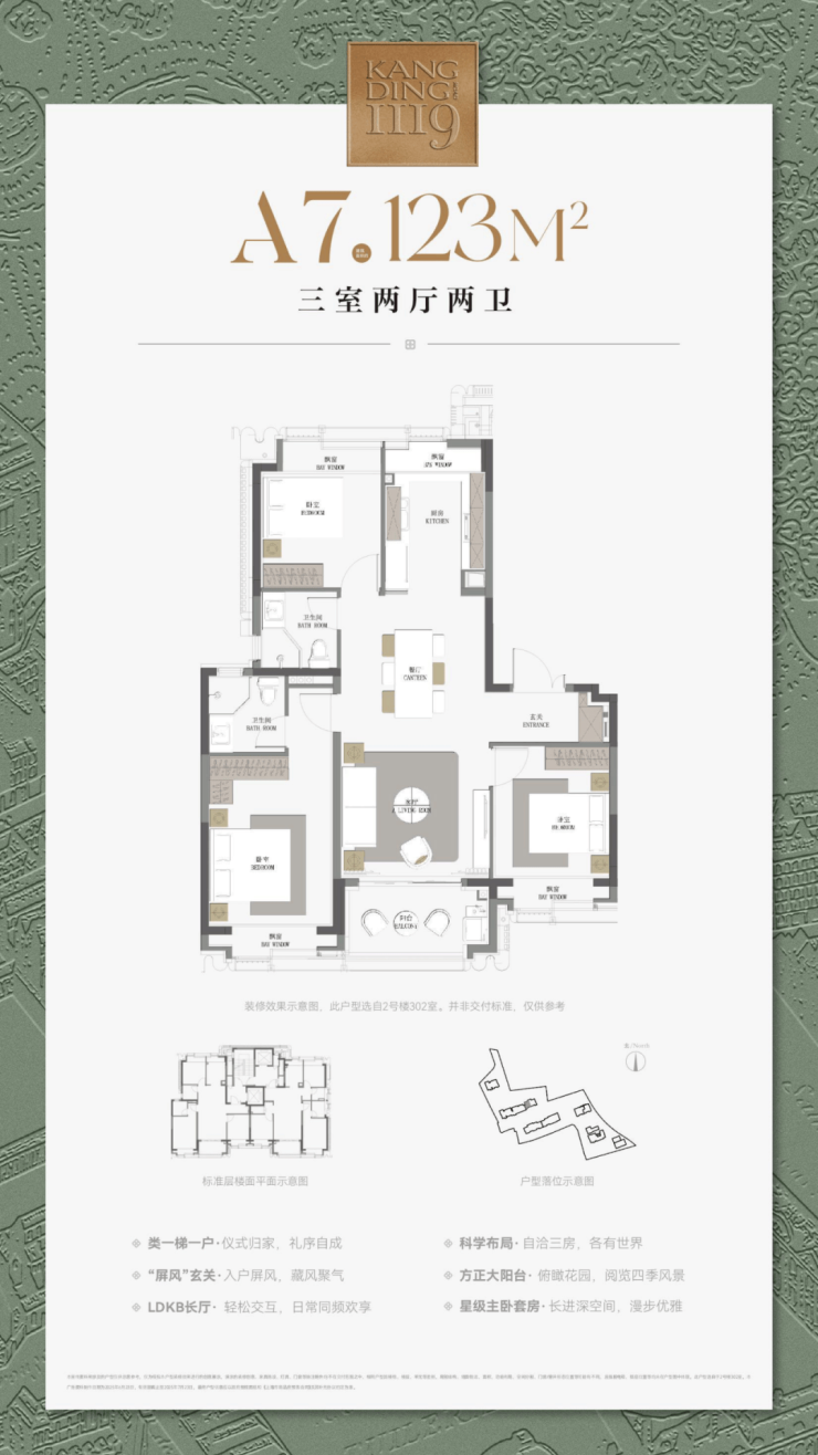 最重要的是,康定壹拾玖这建面约177㎡4房不仅仅是方正,更是飞机户型,三开间朝南+南北通透+无走道的浪费,整个户型相当正气。