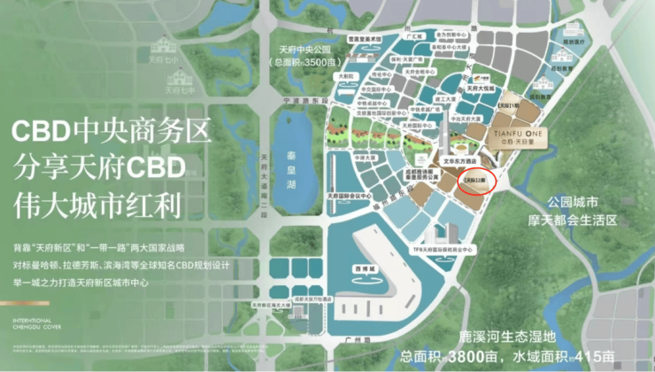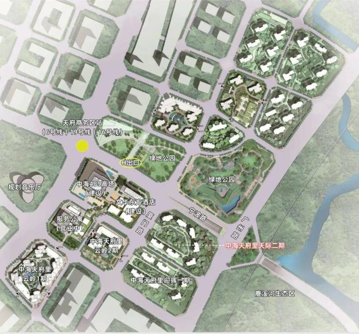 项目的东面,为广州路基鹿溪河生态区;西面为厦门路、中海天府里云岭2期、建设中的文华东方酒店以及中海489米地标性高塔。
