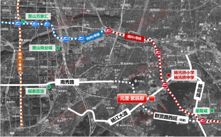 杭绍地铁站(杨汛桥站)800米无缝连接杭城地铁5号线。