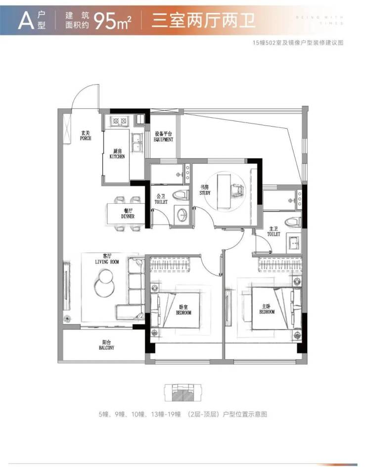 首次置业人群可选建面约95方三房:建面约95㎡为三房格局,2卧+餐客厅三开间朝南,餐客厅连接阳台,2卧自带飘窗,采光通风是同类面积段的极致。