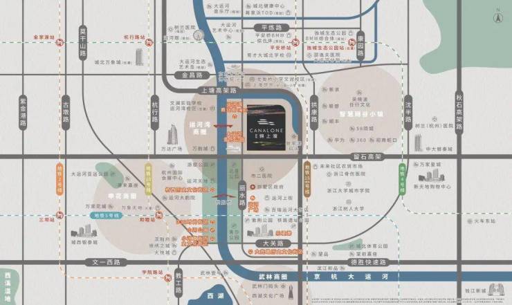 距离项目市二医院约1.8公里,距在建浙江大学医学院附属邵逸夫医院大运河院区约3.1公里。