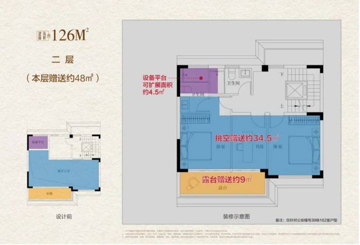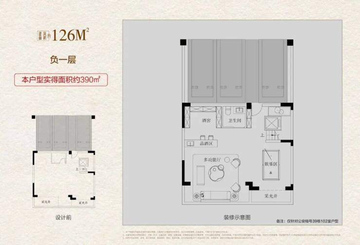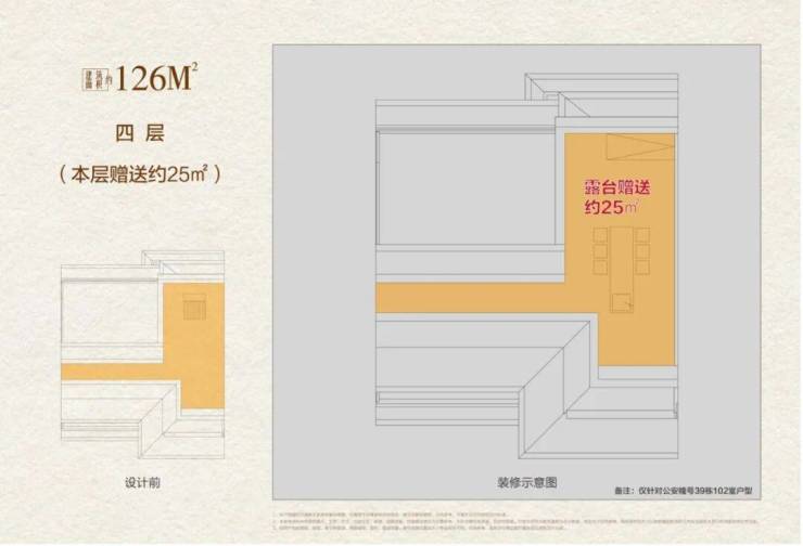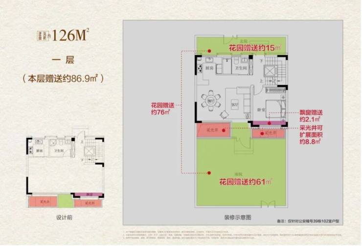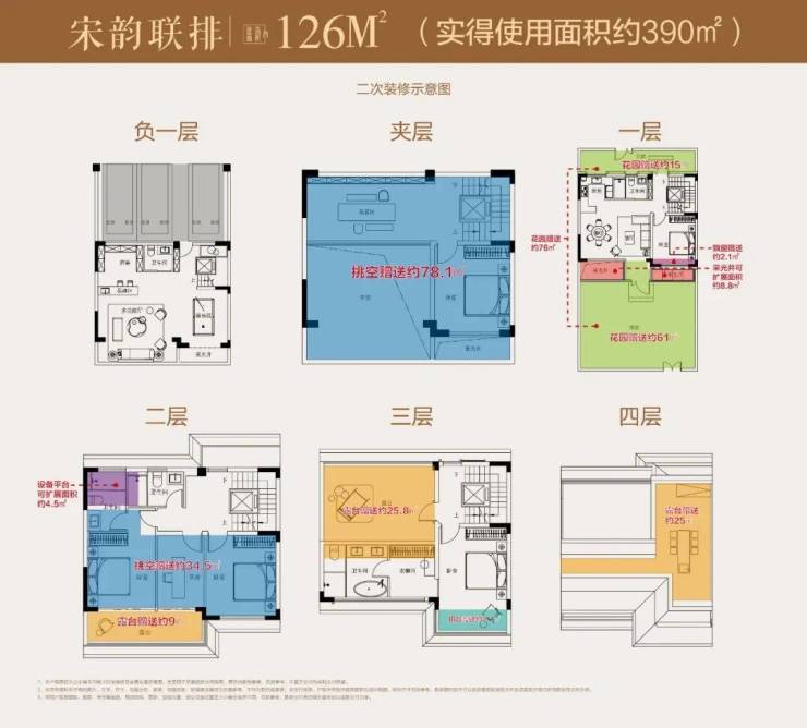 改善进阶:一样的面积,不一样的生活质感,以项目主推的126㎡超级联排别墅为例,通过产品革新营造的极致得房率,实现买126㎡得390㎡的高附赠空间拓展,享受有天有地纯粹墅居生活,满足“居住+社交”双重需求。