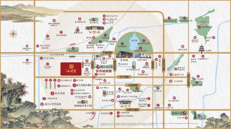 项目择址蒋王核心板块(湖滨名都向西约800米),以京华城3公里黄金生活圈构建生活维度。经过文汇西路、文昌西路两大城市主干道,可瞬息直达京华城商圈、扬州山姆会员商店、蒋王大润发等,万象繁华举步即享。同时,项目周边生态资源丰富,师姑塔体育公园、扬州西花园、沿山河滨水风光带等多重绿意萦绕,繁盛与自然兼得。