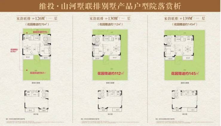依托对产品的精研深耕,【维投·山河墅】在联排别墅产品上实现关键创新,南向院落进深可达约7米,真正带来“户户皆享超大花园”的体验进阶。具体表现为:约126㎡联排别墅附赠花园面积平均约76㎡;约130㎡户型附赠花园面积平均约112㎡;约139㎡联排别墅附赠花园面积平均约145㎡,让产品价值与生活意趣实现双重跃升。