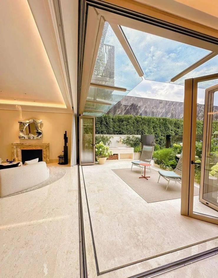 「无界空间」:客厅270度转角无柱设计,搭配落地玻璃,开阔视野将院中风景迎入日常。