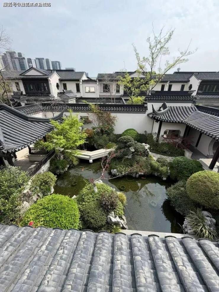 项目以"江南风雅"为景观核心理念,依托天然河道打造300米活水景观轴,两座古风廊桥横跨其上,木作全部采用非洲柚木与俄罗斯铁杉木。东区、西区各设2个中心庭院,单太湖石用量即达1100吨,通过"芝花海棠"花街铺地、叠水飞瀑、老树婆娑等元素,再现"一步一景,步移景异"的苏式园林精髓。