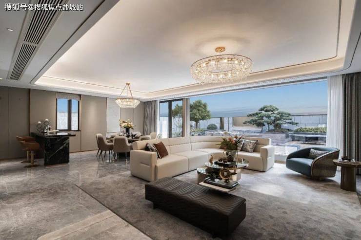 在空间设计上,南向大开间的打造更是独具匠心,平均窗墙比在45%左右。其中首层餐客厅大手笔打造约7米的“IMAX宽屏”落地窗,将窗墙比提升至80%以上,巧妙地融合了自然景致与室内空间。