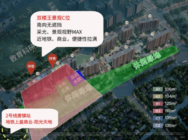 最后两栋楼王,南向无任何楼栋遮挡,可以直面南面的社区核心景观与外部的休闲绿地。