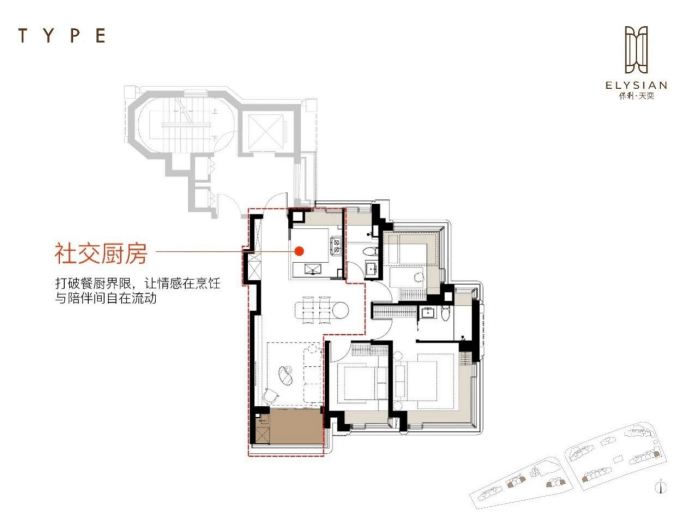 b.客厅非承重墙位于老人房一侧,未来可以自行打通构造出一个X空间,可容纳一孩的多功能房,二孩的儿童房,女主人的化妆间等。