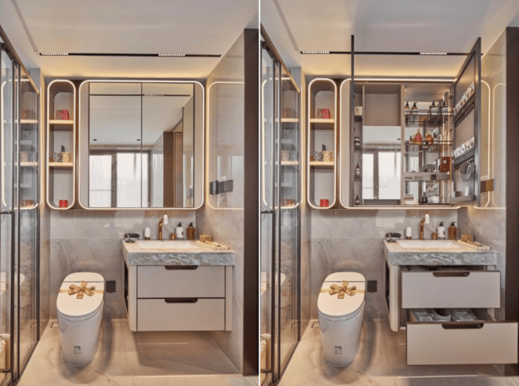 譬如说部分柜体更安全的圆角处理、高柜顶部一窥到底的镜面反光膜、大大提高空间利用的薄抽,不用弯腰一踢即开的踢脚抽设计,便利性大大增加;每一个细节都充分考虑到了未来居住的舒适性,这种产品颗粒度真的令人惊艳!