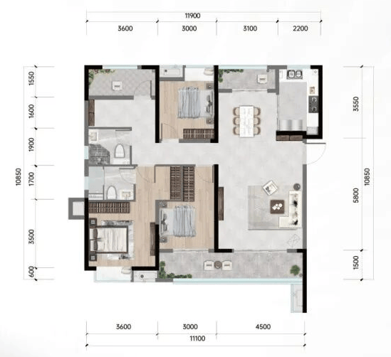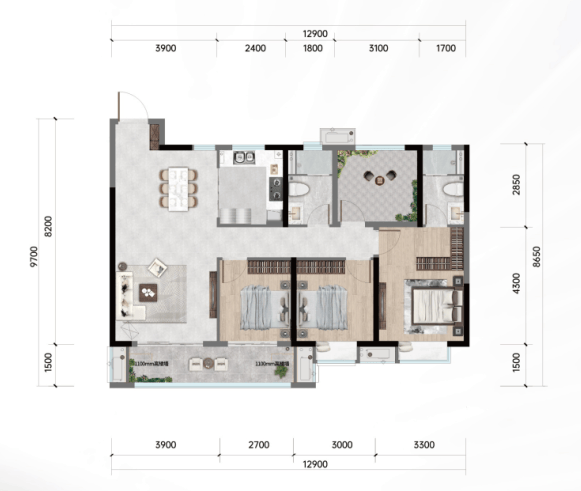 143㎡四房:三开间朝南约11.9米,双阳台设计,得房率高,3+1房布局灵活。