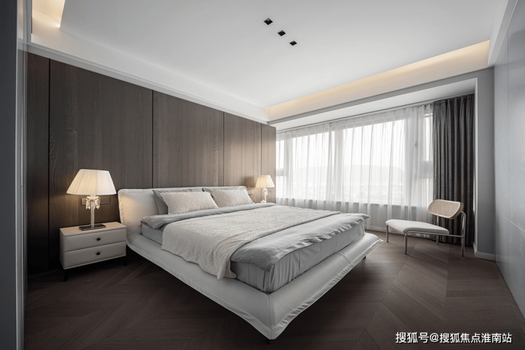 主卧的鱼骨拼木地板与护墙板颜色均选用了深棕色,搭配不同明度的灰色床品与窗帘,摒弃了浮华的装饰,整个主卧空间呈现沉稳有层次感的效果。