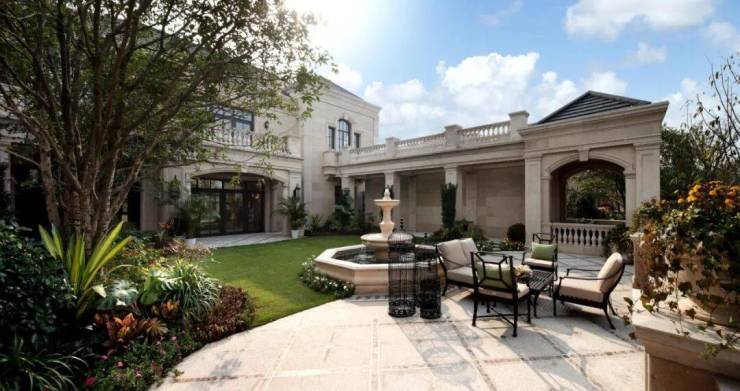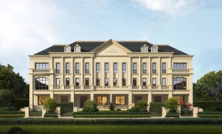 联排建筑的设计,融合了中国传统院落布局与法国枫丹白露宫的审美,外立面大面积采用全石材干挂,檐口等细节部位使用仿石。