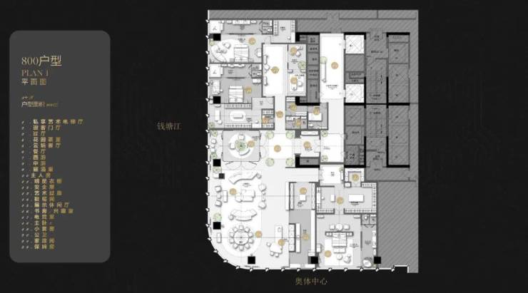 约400㎡A户型,拥有弧形转角江景视野,总面宽约23米。一体化双厅约11.6米×9.4米,面积约109㎡,都够别人一套三房两卫了。