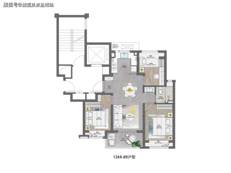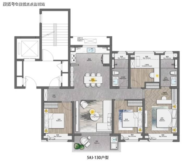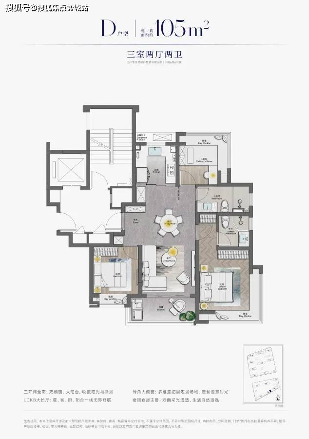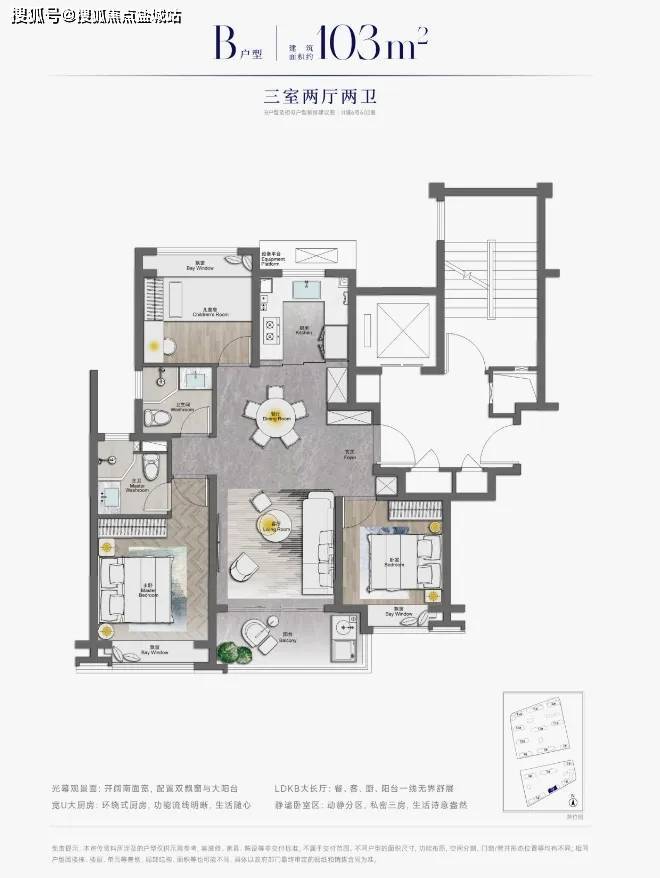 ③设计感上, 南北通透、三开间朝南、卫生间的干湿分离、全卧室带飘窗、U型厨房,这个户型拥有一个好户型拥有的全部优势。