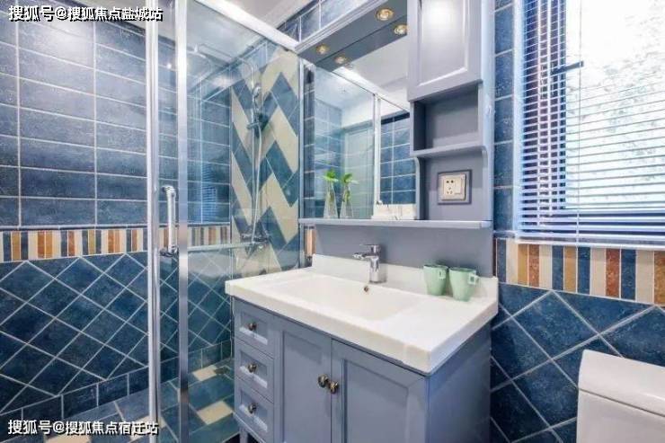 卫浴间也是一贯简明基调,蓝色铺满整个空间,仿佛带着海的气息,指引着去往某处。