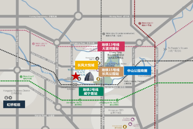 紧邻长风大悦城(150米)及国盛中心等商业体;教育配套涵盖金沙江路小学(公立,800米)、天山初级中学(公立,660米)及金宝幼儿园(私立,1.2公里);医疗资源包括上海市同仁医院(三级,2.2公里)及仙霞街道社区卫生中心(1.4公里);周边高端社区有中海紫御豪庭、雅戈尔长风8号等,并毗邻长风公园与苏州河景观带。