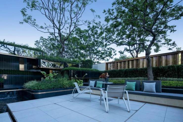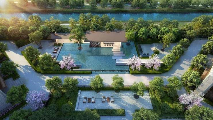 社区外部沿河景观廊道,铺陈花园小品设计,赋予居者一方徜徉水岸,沉醉于自然诗意,在城市繁华中拾起自然的生活乐趣。