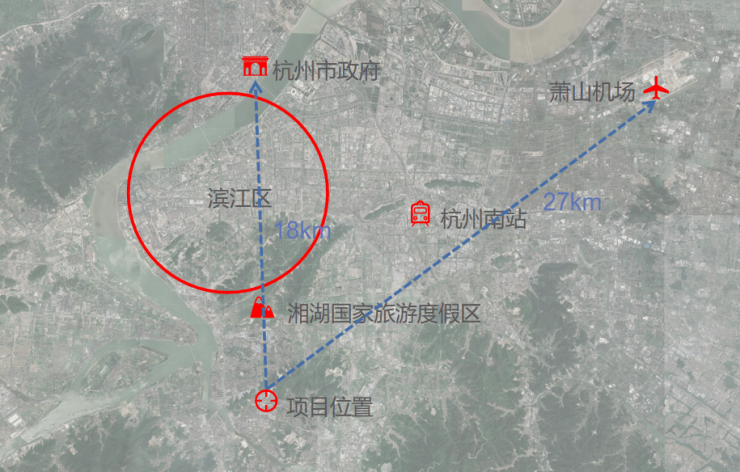 体,东临规划道路,四周交通便利。距滨江12公里,杭州市政府18km,杭州南站12km,萧山国际机场27km