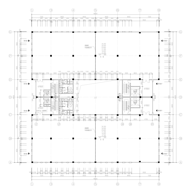 回型四拼:单户面积:2,085㎡;总户数:4户;标准层面积:650㎡;层高: 一楼7.8m二楼5.5m三楼4.5m四楼4.0m;总层数:4;预留电梯数:4