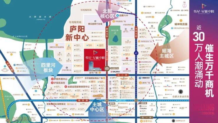4、新中芯人潮:周边汇聚天赐园、杏花苑、融创长江壹号、融创融宁府、金都华庭、梧桐嘉苑等80+个小区;六安路小学、红星路小学、庐阳中学等超10所学校,汇聚近30万海量客流,撬动庐阳新财富。
