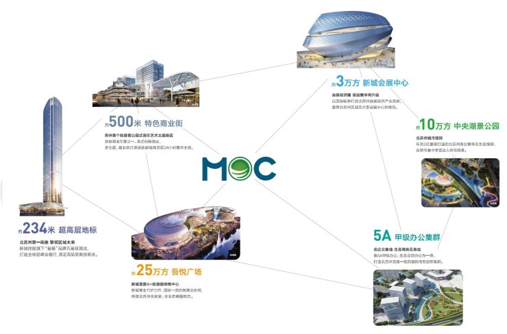 MOC芯城汇是苏州“一城四核”战略下高铁新城规划成型的关键,也是长三角洲建设世界级城市群的中枢高地和活力载体。项目内建设234米超高层地标,23万方吾悦广场旗舰店,3万方会展中心,10万方中央水景公园,500米长的芯光里商业街,5A甲级办公楼集群等。