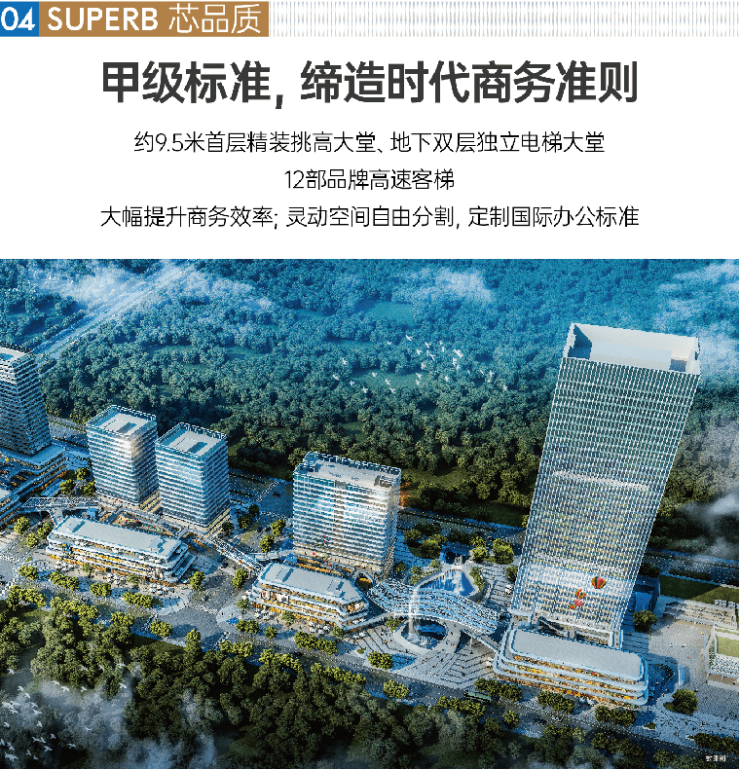 极致产品属性——核心区内甲级商务次地标,总高约150米,大堂9.5米挑高,层高达4.15米,整层面积约1140平-2000平,亦可半层或整层定制,满足各类企业所需。