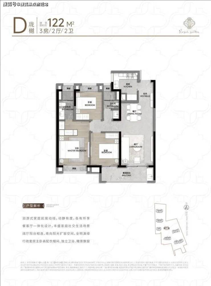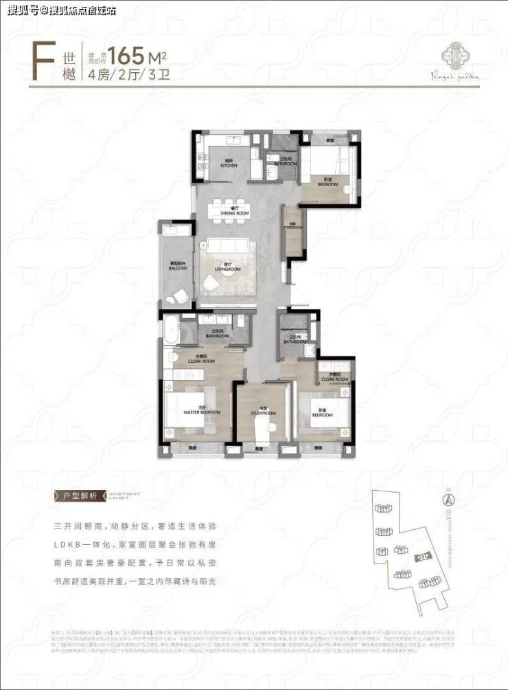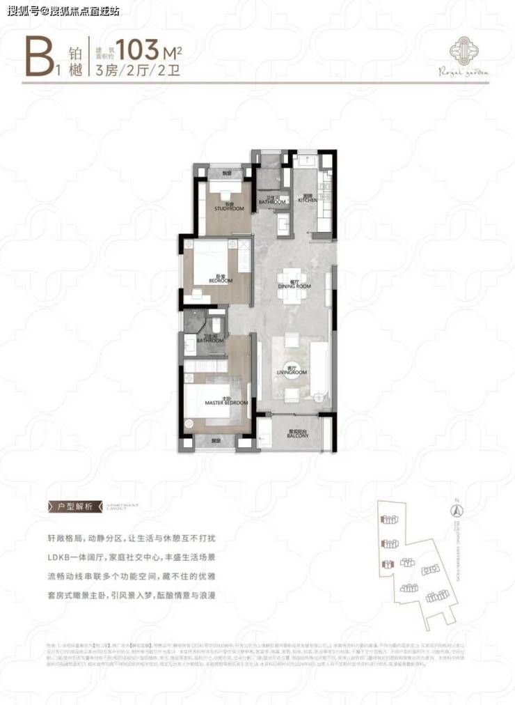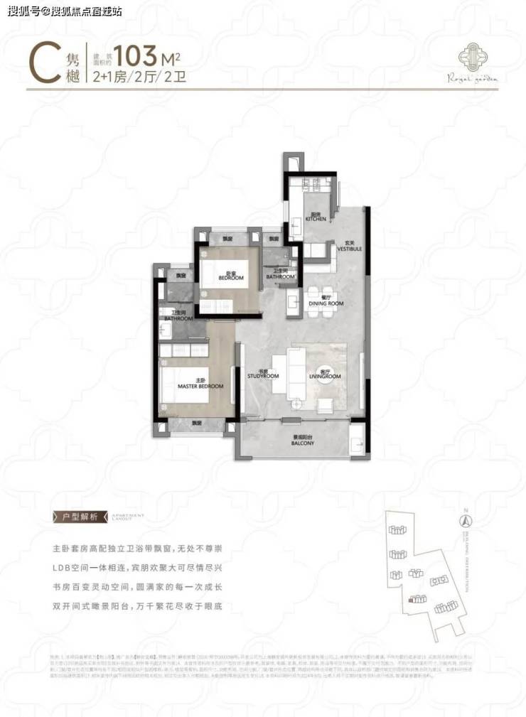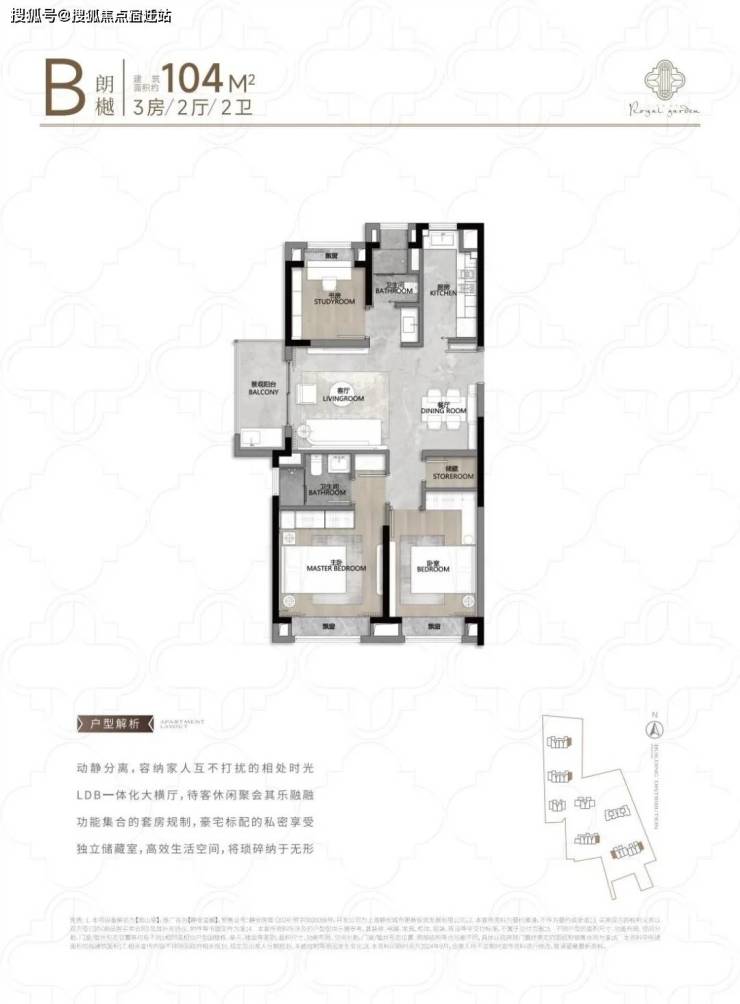104㎡3户型特点:该户型多为楼栋的东边套,是一个观景户型。客厅连接270°阳台,视野出众。双卧朝南,阳光满溢。从次卫布局看,如果家庭人口较少,该户型还能做成双套卧。
