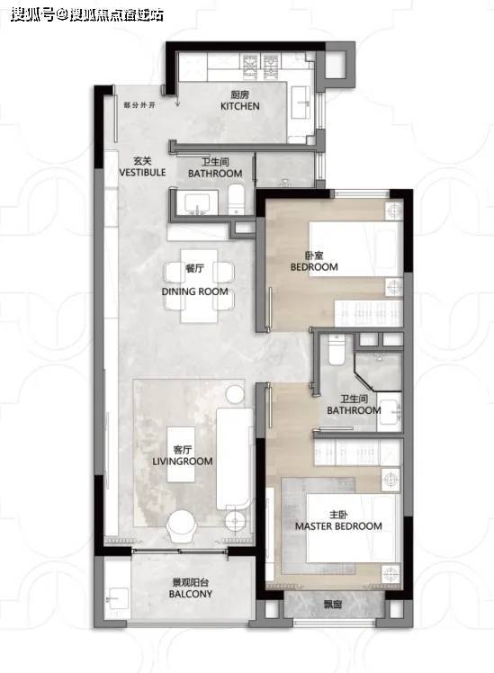 第二个亮点,是动静分离+客餐厅一体化设计,功能区和休息区互不干扰,客餐厅、厨房等公共活动区集中在一侧,卧室等休息区全部一侧,保证了私密性!