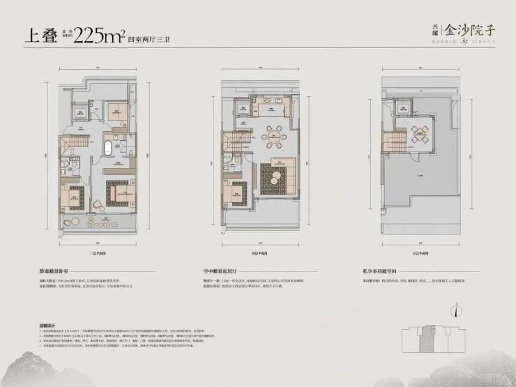 金沙院子,兴耀首个超级院墅,上下双叠。上叠面积255方,下叠约245方,最小花园115方。