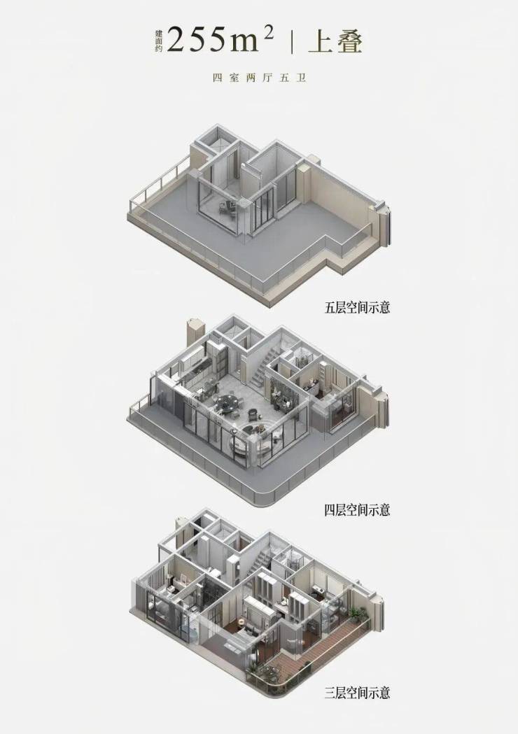 让空间更多地向风景打开,且与当代家庭的日常栖居结合,每一层都勾勒出独特的生活场景。边套约10.2m的开间,L形露台设计,勾勒270°景观视野。三楼卧室层的私密优雅、四楼餐客厅层的社交开阔、五楼的云端闲逸,上下之间,雍享天地,构筑一个兼具仪式感与舒适度的理想居所。