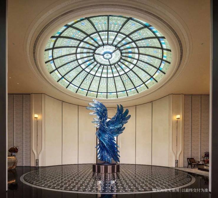 玉兰门庭—迎归大堂—莳花荟 为主轴,敬献步履生辉的归家艺旅: 玉兰门庭 如繁花盛绽, 尊华瑞鳞水景 聚运生财, 双尊铜狮 镇守家宅; 迎归大堂 流转光影艺韵, 百羽栖澜艺术雕塑、芦海宸韵非遗绣作 流淌摩登气韵; 莳花荟中央会客厅 移步异景,献映会客、休闲等雅会。